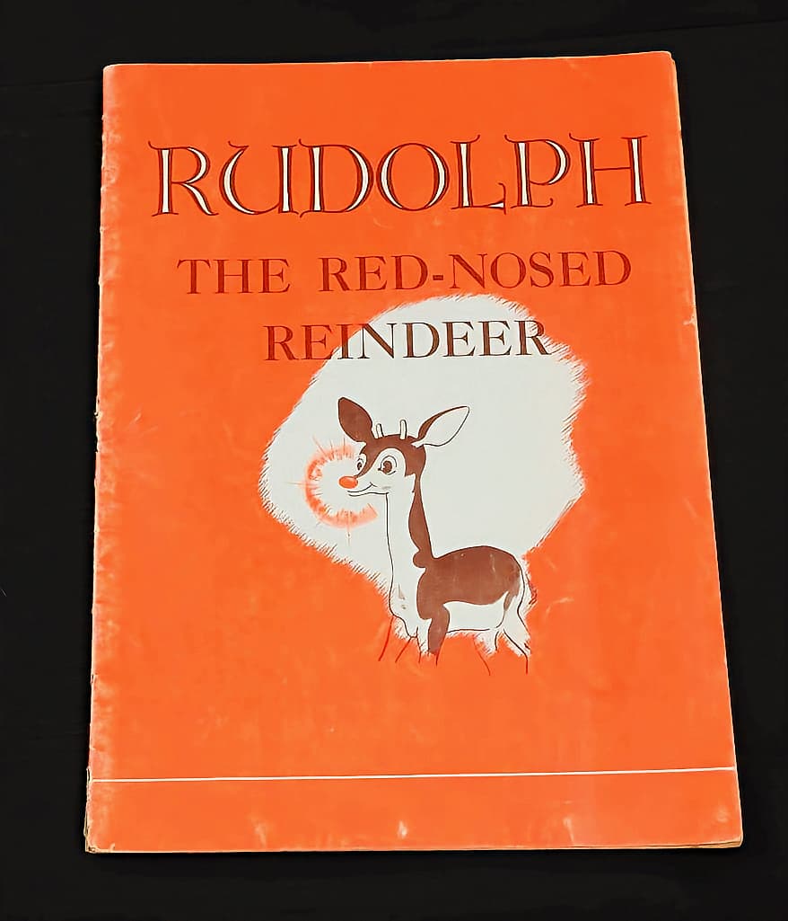 Bob’s poem was published into a booklet and distributed by Montgomery Ward during the 1939 holiday season. The response was overwhelming, with an initial 2.4 million copies and another 3.6 million going out in 1946 after wartime restrictions on paper use were lifted. That same year, Bob received an offer from RCA Victor to do a spoken-word record of his poem. Seventy-five years ago, in 1947, with the 6 million free copies having run their course, commercial publication of Rudolph’s story began. Other Rudolph products were also available, such as stuffed reindeer toys, picture puzzle books, and children’s slippers.