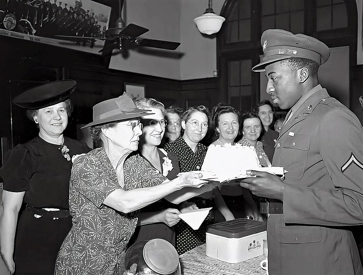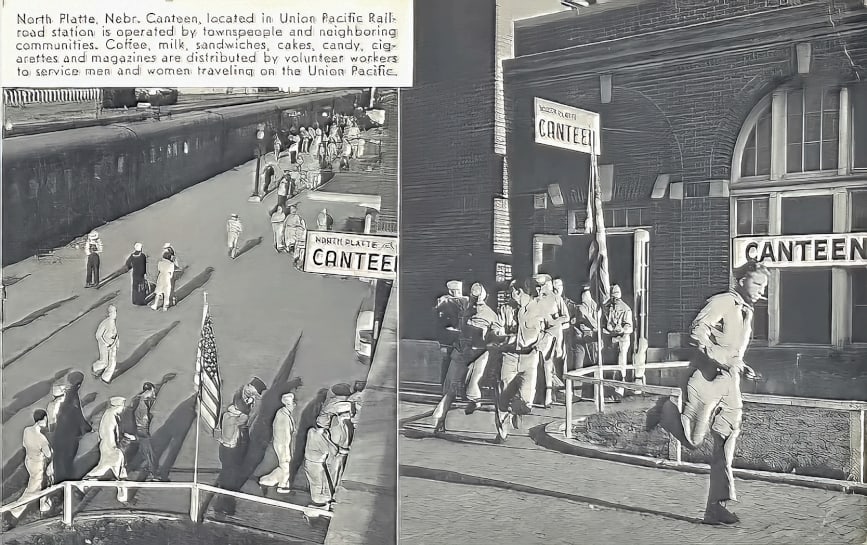 Starting 81 years ago, on December 27, 1941 and continuing through the War 365 days a year, volunteers from North Platte and surrounding communities provided drinks, food, gifts, encouragement and prayers for young soldiers passing through. Many families, churches, businesses, schools and civic clubs contributed to raising money, purchasing supplies and preparing food. Much of the food served in the canteen came from area farms. There were even birthday cakes for anyone having a special day. Some days they served as many as eight thousand soldiers and sailors. For some of them, this would be the last real taste of home that they would experience until after the war, and for some…it would be the last they would ever have.