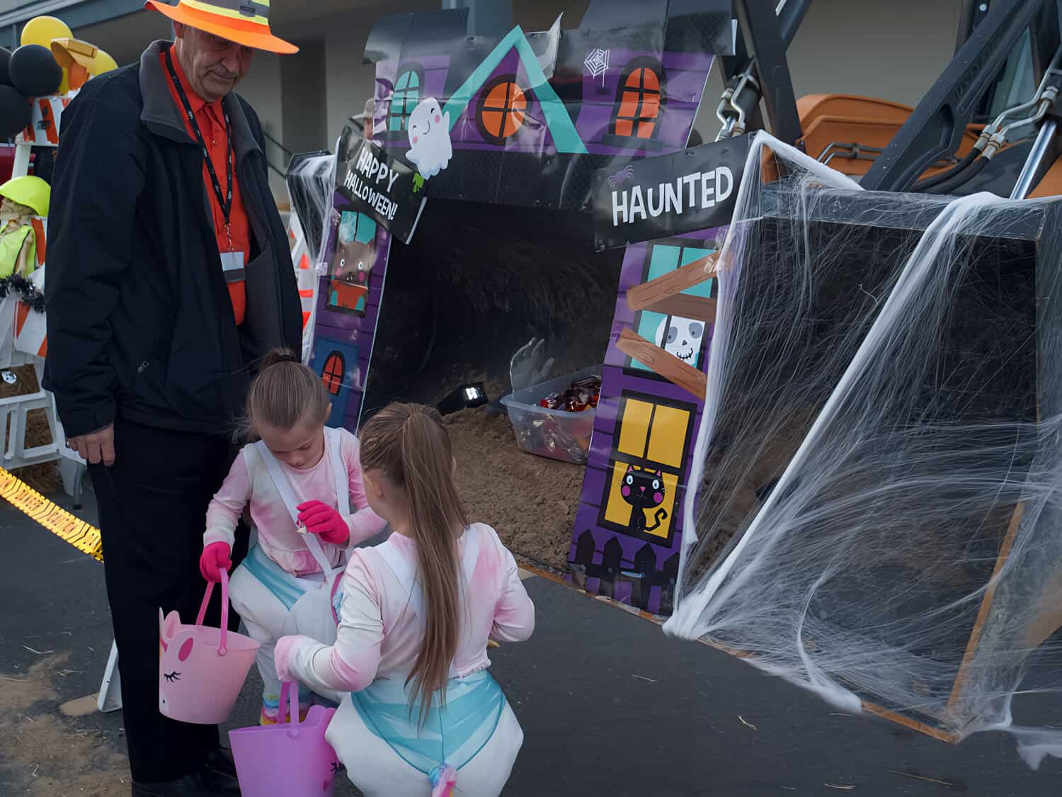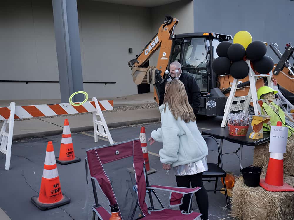 Lakes Supervisor Katy Harmon was responsible for decorating the Public Services booth. In addition, Harmon donated 40 goodie bags for the kids with Halloween pencils, stickers, and candy. Ken Unger, HSV Public Services Director, and Todd Noles, HSV Superintendent, manned the well-decorated booth, which not only boasted of treats but displayed a backhoe and featured a ring toss game for children. Aiming towards traffic cones, the children were awarded a bag of goodies. Ironically, another name for traffic cones is “witch hats.”