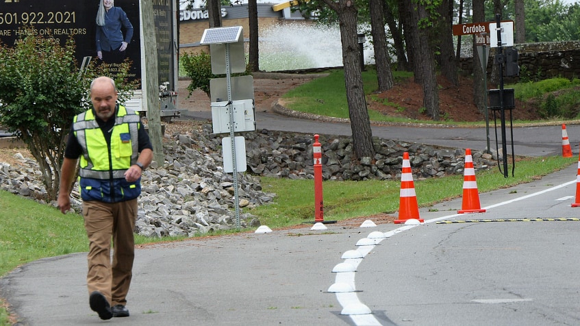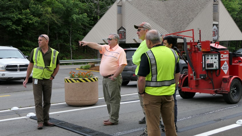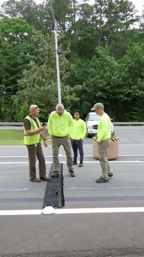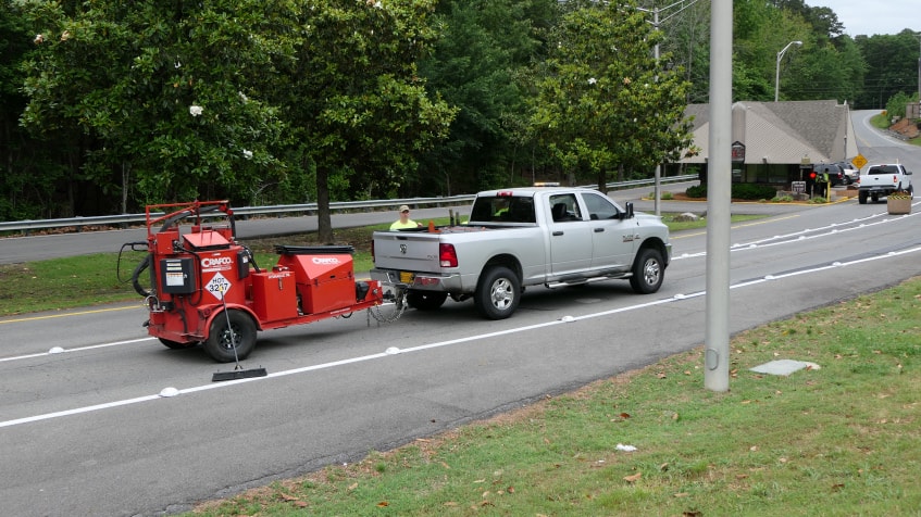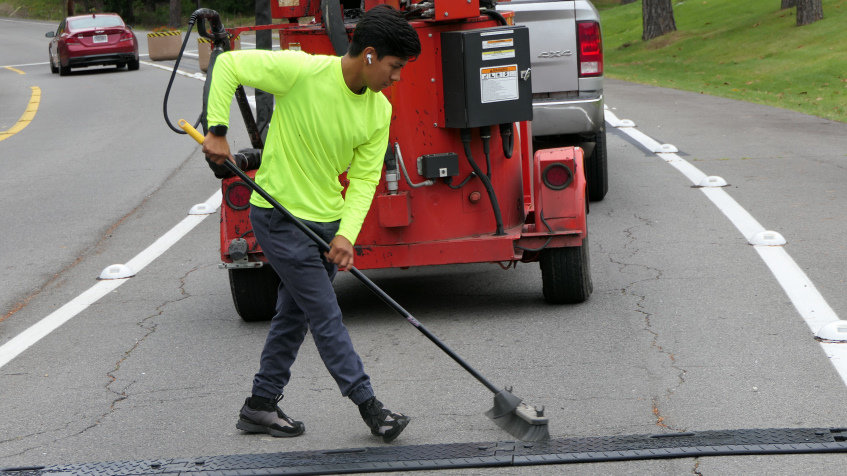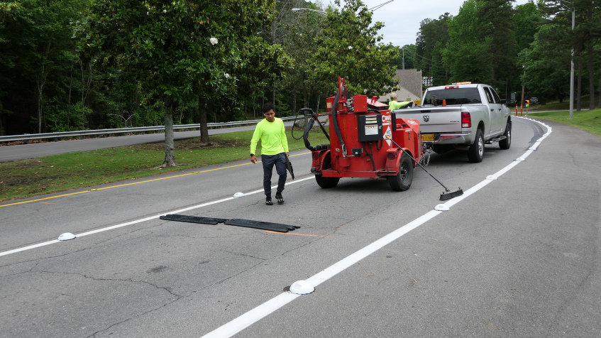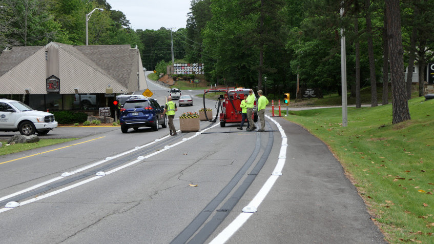 In an effort to increase safety at the gates, the Hot Springs Village POA contracted with Mitchell Seal Coating to add additional rumble strips. The owners of the company, Dale and Kyle Schildgen were assisted by employee, Misael Garcia, with the installation of two new rumble strips in the West Gate decal lane.